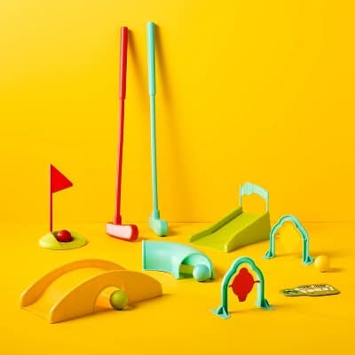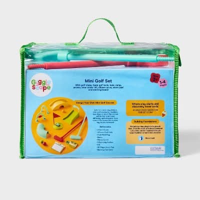 Your little one will love playing with this customizable Mini Golf Set from Gigglescape by themselves or with friends and family. This 14-piece set includes golf clubs, foam golf balls, a score pad, an over-under hill and more to encourage movement. Made for one to four players, they can design their own mini golf course and add elements from around the house for an extra challenge. This set is safe for inside play and comes in a zip-closure bag with a top handle for easy storing and carrying. Gigglescape: Where play starts and discovery never ends.