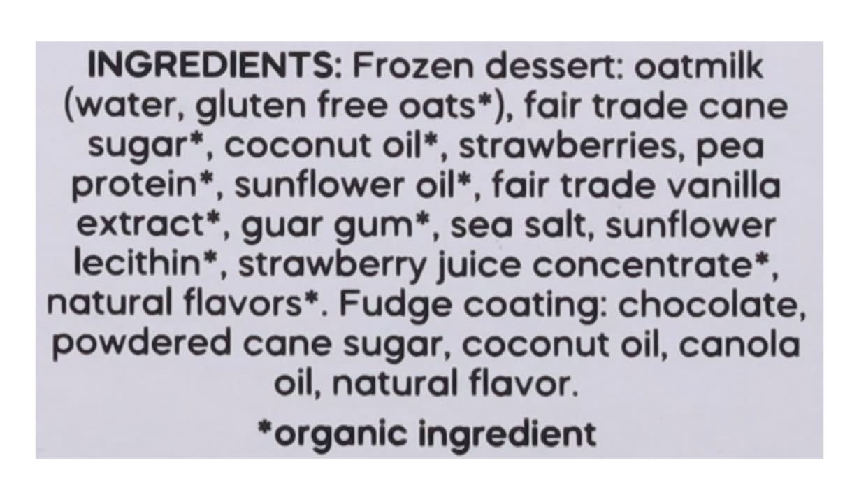 Frozen Dessert: Oatmilk (Water, Gluten Free Oats*), Fair Trade Cane Sugar, Coconut Oil*, Strawberries, Pea Protein*, Sunflower Oil*, Fair Trade Vanilla Extract*, Guar Gum*, Sea Salt, Sunflower Lecithin, Strawberry Juice Concentrate*, Natural Flavors*, Fudge Coating: Chocolate, Powdered Cane Sugar, Coconut Oil, Canola Oil, Natural Flavor. * Organic Ingredient Contains: Oat, Tree Nuts, Coconuts