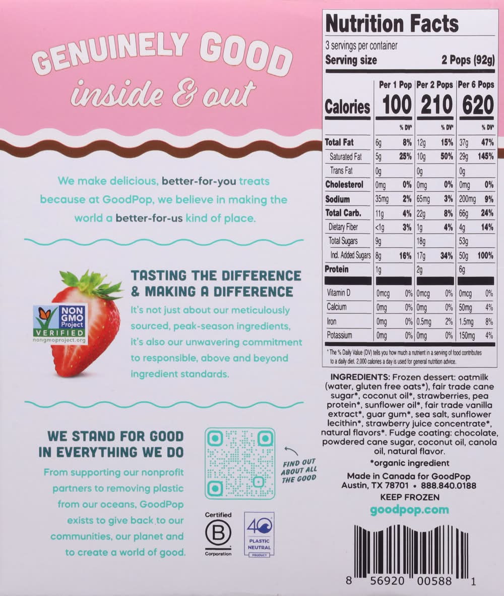 GoodPop Neapolitan Dairy-Free Oat Milk Frozen Dessert Bars, Strawberry-Vanilla (2.2 fl oz, 6 ct)