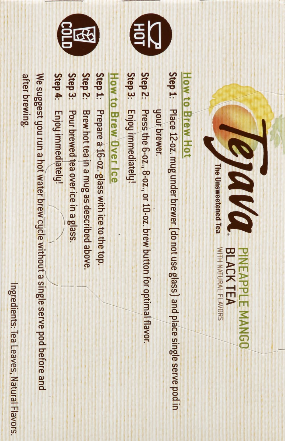 Sustainable Single Serve Pods in 3 Easy Steps: 1 cool; 2 peel; 3 recycle. Allow at least 2 minutes to cool pod. Carefully peel foil lid off & remove filter with tea grounds. Compost grounds & filter or discard. Recycle aluminum lid & plastic pod wherever these recyclables are accepted. How to Brew Hot: Step 1: Place 12-oz. mug under brewer (do not use glass) and place single serve pod in your brewer; Step 2: Press the 6-oz., 8-oz., or 10-oz. brew button for optimal flavor; Step 3: Enjoy immediately! How to Brew Over Ice: Step 1: Prepare a 16-oz. glass with ice to the top; Step 2: Brew hot tea in a mug as described above; Step 3: Pour brewed tea over ice in a glass; Step 4: Enjoy immediately! We suggest you run a hot water brew cycle without a single serve pod before and after brewing.