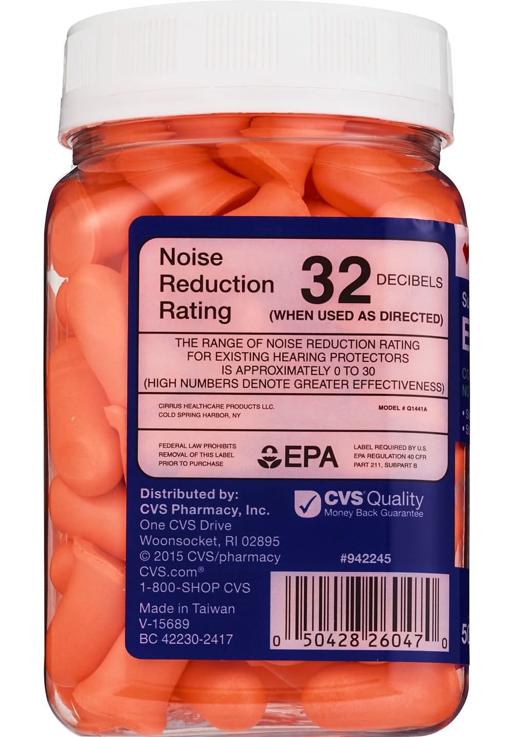 Model No. QZ313A. Comfortable. Noise reducing. Sleep; Study; Work; Power tools; Loud events; Concerts. Noise Reduction Rating: 32 decibels. Sound Attenuation Data: 125 Hz Frequency: 39.3 dB mean attenuation; 3.9 dB standard deviation. 250 Hz Frequency: 41.1 dB mean attenuation; 4.8 dB standard deviation. 500 Hz Frequency: 41.8 dB mean attenuation; 4.7 dB standard deviation. 1000 Hz Frequency: 38.7 dB mean attenuation; 3.7 dB standard deviation. 2000 Hz Frequency: 39.9 dB mean attenuation; 3.8 dB standard deviation. 3150 Hz Frequency: 46.5 dB mean attenuation; 3.2 dB standard deviation. 4000 Hz Frequency: 47.5 dB mean attenuation; 3.7 dB standard deviation. 6300 Hz Frequency: 49.9 dB mean attenuation; 4.1 dB standard deviation. 8000 Hz Frequency: 50.1 dB mean attenuation; 3.3 dB standard deviation. The level of noise entering a person's ear, when hearing protector is worn as directed, is closely approximated by the difference between the A-weighted environmental noise level and the NRR. Example: 1. The environmental noise level as measured at the ear is 92 dBA. 2. The NRR is (32) decibels (dB). 3. The level of noise entering the ear canal is approximately equal to (92 dB [A]-32 NRR) dB(A). Although hearing protectors can be recommended for protection against the harmful effects of impulsive noise, the noise reduction rating (32) is based on the attenuation of continuous noise and may not be an accurate indicator of the protection attainable against impulsive noise such as gunfire. Noise Reduction Rating: 32 decibels (when used as directed). The range of noise reduction rating for existing hearing protectors is approximately 0-30 (high numbers denote greater effectiveness). EPA. CVS quality guarantee. www.cvs.com. Made in Taiwan.