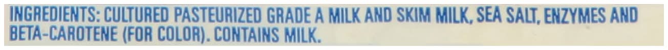 Cultured Pasteurized Grade A Milk and Skim milk, Sea Salt Enzymes and Annato Extract (for Color). Contains: Milk, Gluten