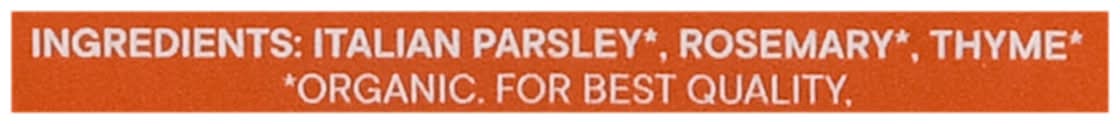 Ingredients: Italian Parsley*, Rosemary*, Thyme*. * Organic