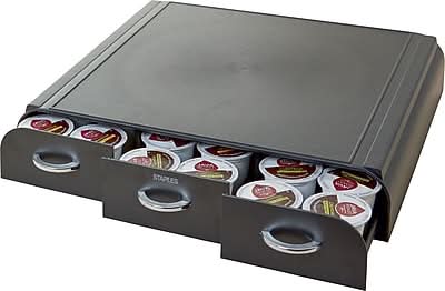 Three drawers coffee holder to organize all your favorite single-serve coffee pods. The Staples Coffee Pod Drawer can store up to 36 K Cups with its discreet, space-saving design at a great value. Featuring durable plastic construction, this K Cup organizer fits perfectly beneath coffee-pod brewing units to save valuable counter space. Impress your clients by adding this stylish coffee storage organizer in your breakroom now! - Anchor Coffee pod storage triple drawer allows to place single serve coffee machine on its top to save valuable counter space in office or home - Holds 36 K-cup® single serve coffee pods and each drawer holds 12 pods - Color: Black, Material: Upscale plastic - Dimensions: 2.72H x 13.46W x 12.87D - Six rows to help organize favorite flavors - Forget the cheap wire mesh holders with sticky drawers and flimsy construction - Built with superior materials for durability - Features quality materials construction so the drawers will remain smooth even with the weight of a coffee machine over it - Has durable chrome handles Three drawers organize all your favorite single-serve coffee pods