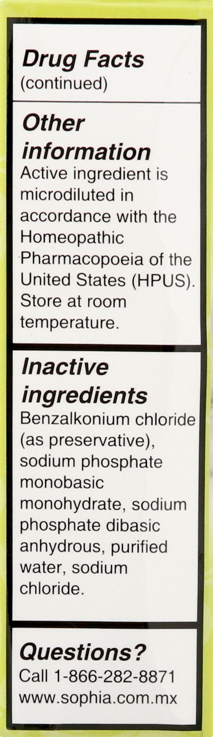 Sodium Phosphate Monobasic Monohydrate, Sodium Phosphate Dibasic Anhydrous, Purified Water, Chamomilla (Matricaria Chamimilla L) 3X HPUS, Benzalkonium Chloride, Sodium Chloride Contains: None