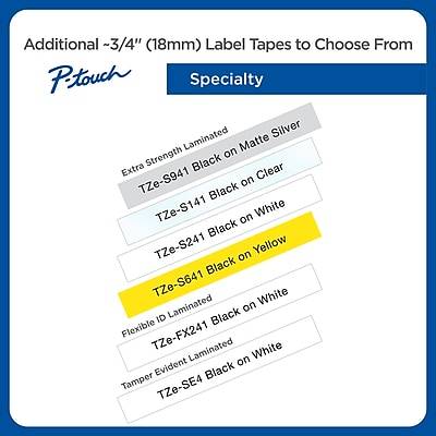 Design high-quality glossy labels with this Brother TZe series 0.7-inch black-on-white label tape. Create professional labels that adhere to smooth, flat surfaces with this label tape designed to work with P-touch labelers. This Brother 0.7-inch label tape features a 26.2-foot yield and is suitable for use in most indoor or outdoor settings. - Create labels for home, work, or school with this 0.7W label tape with 26.2' yield - Black ink on the white tape creates easy-to-read text - Compatible with P-touch PT-1230, 1600, 1650, 1760 (see expanded description for more) - Thermal print technology requires no ink or toner - Safety Data Sheet Strong Laminated Adhesive Backing Make sure labels firmly attach to dry, flat surfaces when you use this Brother TZe-241 3/4-inch P-Touch label tape. Designed with a strong laminated adhesive backing, this tape is ideal for smooth areas such as file folders and plastic containers. Clear Black Print on White Tape Identify your organized items quickly thanks to the bold, black print on this white P-touch label tape. The bright background highlights your prints for swift identification. Label candy jars and glass containers in your retail store while maintaining a professional appearance with the clean design of this black-on-white tape. Suitable for Indoor and Outdoor Use Stick this Brother TZe-241 3/4-inch P-Touch label tape to storage boxes and containers without worrying over rapid peeling or fading prints. This tape is suitable for both typical indoor and outdoor use, and it maintains its clear black on white color even when exposed to hot and cold environments.