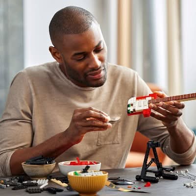 Create your own brick-built 1970s Fender Stratocaster guitar and 65 Princeton Reverb amplifier with this LEGO Ideas DIY guitar set for adults (21329). Recall the legendary musicians who have played a Stratocaster as you recreate its iconic curves and add authentic details such as the posable whammy bar, pickup switch and tuning pegs. The buildable amp has removable panels for easy viewing of the motherboard, reverb tank, speaker and other interior details, plus rubber cables to connect it to the guitar and footswitch. This collectible set includes bricks to build the guitar in either red or black and guitar accessories: picks in 4 colors plus an elegant, foldable stand for the guitar model to complete a delightful display piece. There is also a sticker with the Fender logo made from LEGO bricks to attach to your real guitar or amp. This collectible DIY guitar kit is a top birthday present or gift idea for teenagers and adult guitar players, Fender fans, music lovers and keen LEGO builders. A fan designer entered this cool building set in the LEGO Ideas ‘Music to our Ears’ contest and was chosen from the top 9 entries to become the next LEGO Ideas set by the LEGO Ideas review board. It sure will make a striking centerpiece at home or in the office. The guitar measures over 14 in. (36 cm) long, 4 in. (11 cm) wide, and 1 in. (3 cm) deep. Contains 1074 pieces.