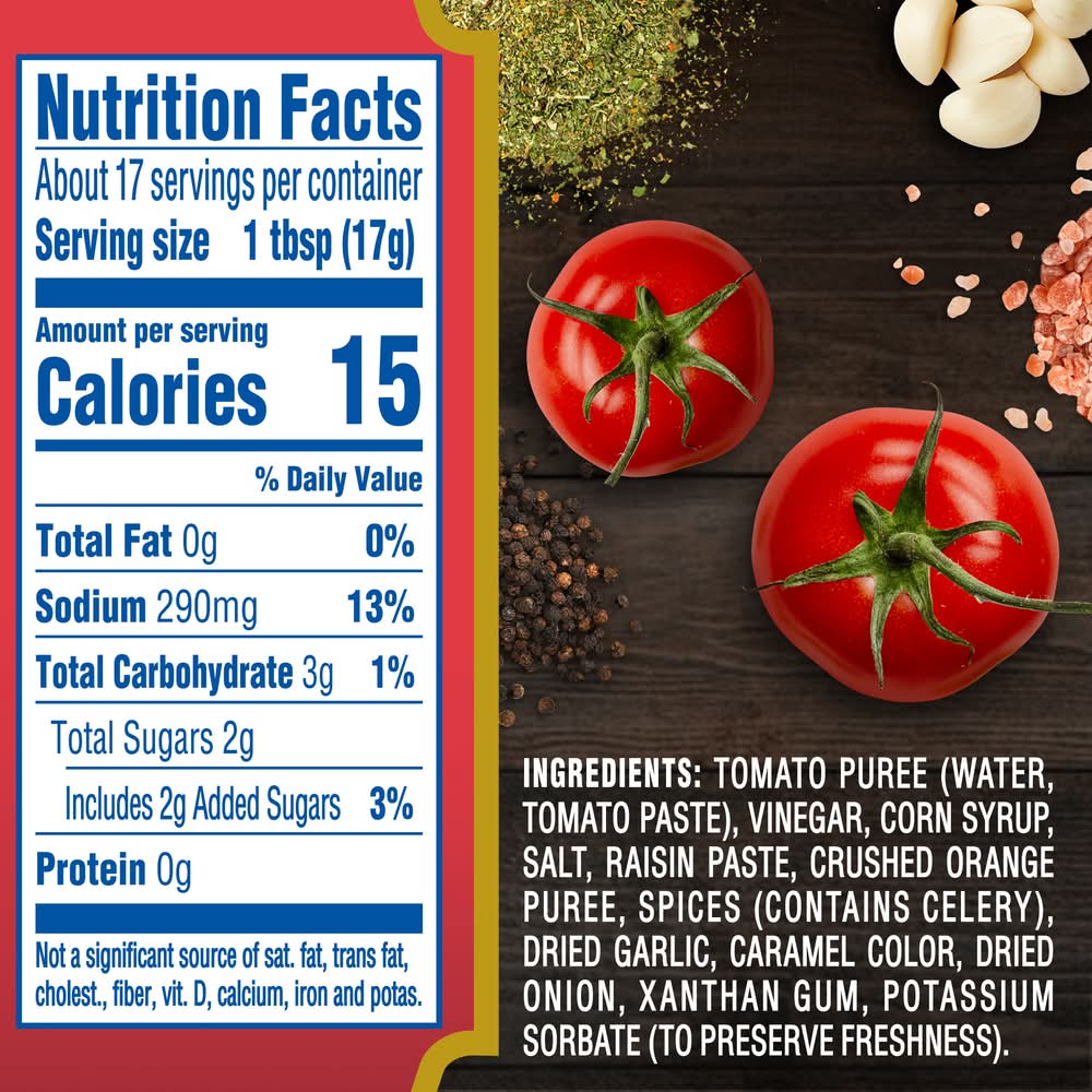 Ingredients: TOMATO PUREE (WATER, TOMATO PASTE), VINEGAR, CORN SYRUP, SALT, RAISIN PASTE, CRUSHED ORANGE PUREE, SPICE, DRIED GARLIC, CARAMEL COLOR, DRIED ONIONS, POTASSIUM SORBATE (TO PRESERVE FRESHNESS), XANTHAN GUM, CELERY SEED Contains: Celery, Corn (Maize)