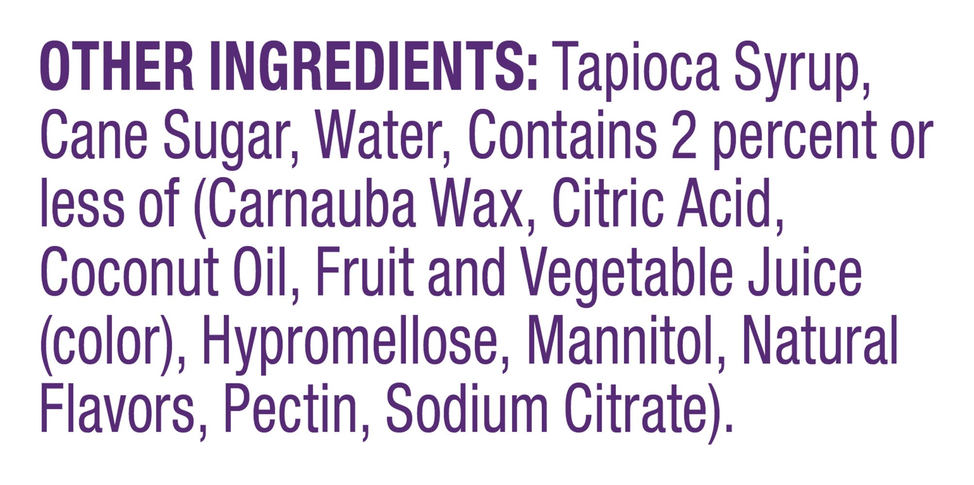 Ingredients: Other Ingredients: Tapioca Syrup, Cane Sugar, Water, Contains 2 Percent or Less of (Carnauba Wax, Citric Acid, Coconut Oil, Fruit and Vegetable Juice (Color), Hypromellose, Mannitol, Natural Flavors, Pectin, Sodium Citrate)