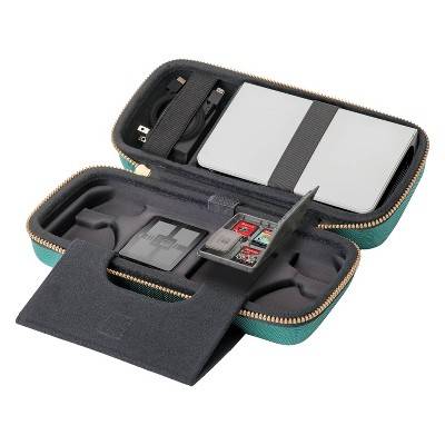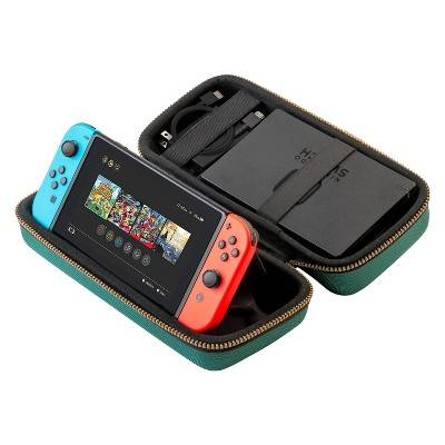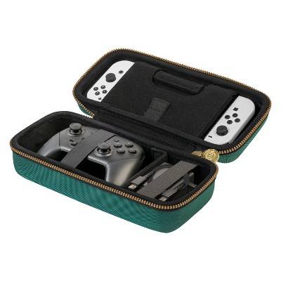 Controller or Nintendo Switch Joy-Con Grip. This beautifully understated case in The Legend of Zelda: Tears of the Kingdom emerald green features a bronze-finish metal badge emblazoned with the Zelda logo. The hard shell case firmly holds and protects your Nintendo Switch Pro Controller or Nintendo Switch Joy-Con Grip within the recessed bottom insert. To round out the thoughtfully-designed features of this case, store your charging cables and Joy-Con straps in the upper mesh pocket.