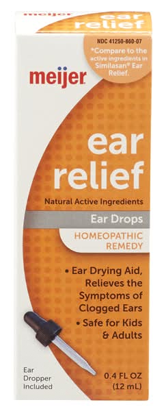 Meijer Ear Relief Ear Drops are formulated to alleviate symptoms associated with clogged ears. These drops are in a liquid state and come packaged in a bottle, specifically intended for use in the ears.