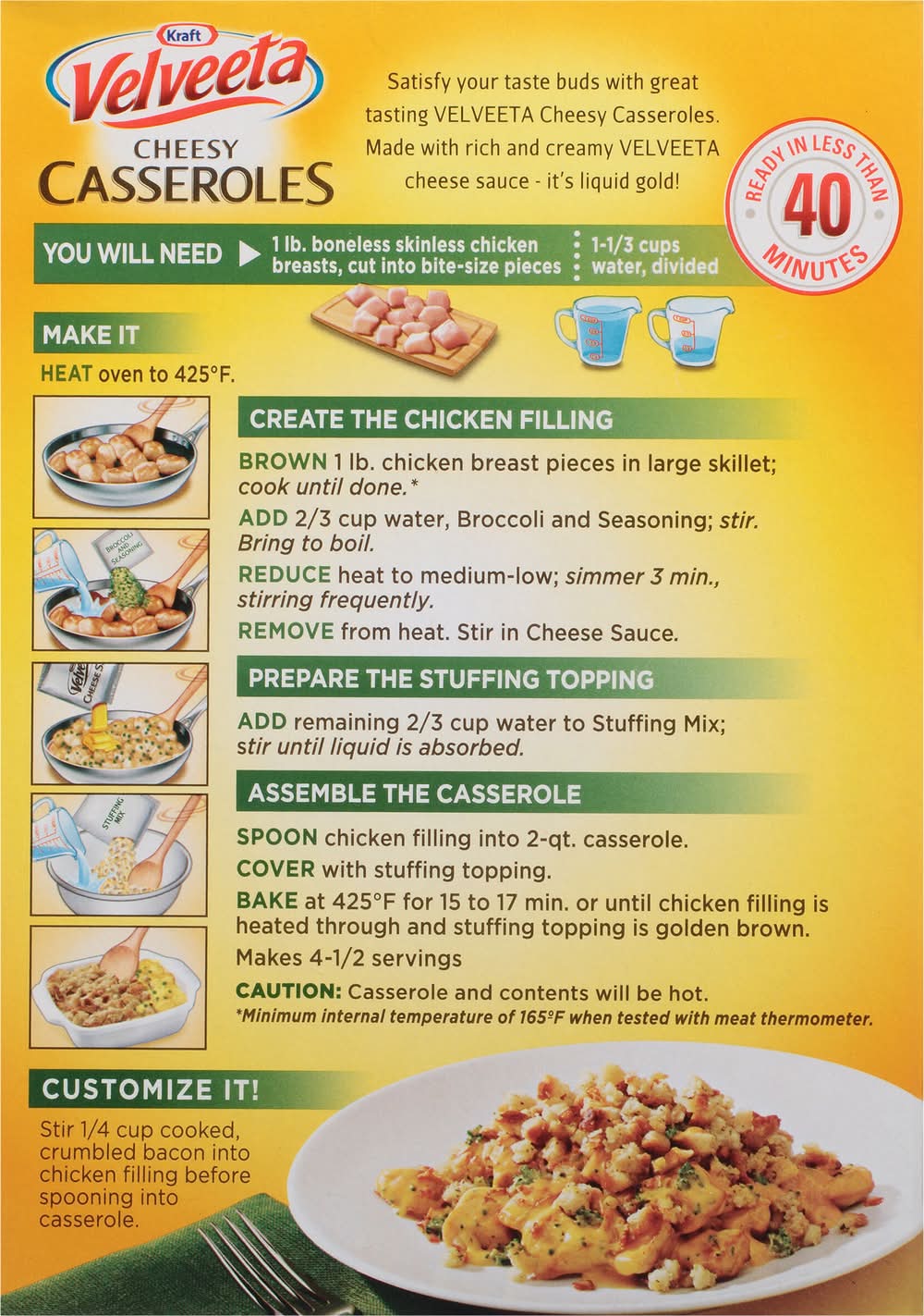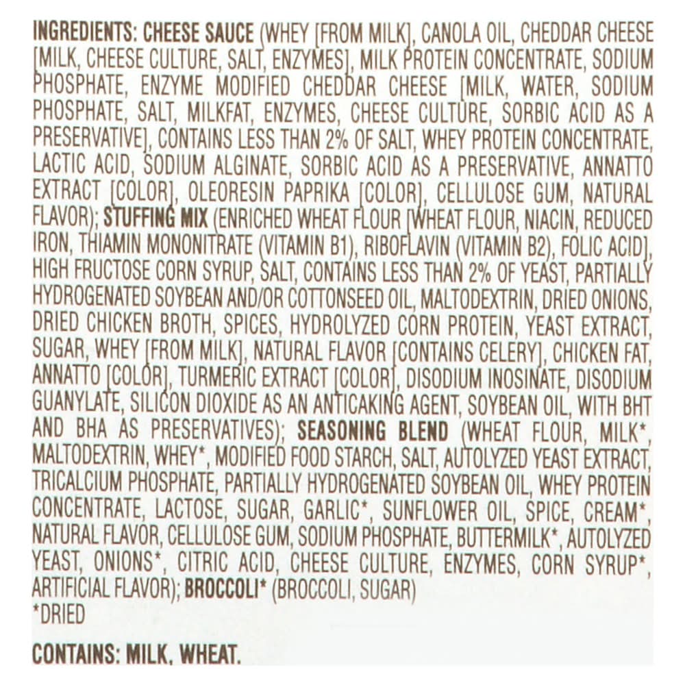 Cheese Sauce (Whey [from Milk], Canola Oil, Cheddar Cheese [Milk, Cheese Culture, Salt, Enzymes], Milk Protein Concentrate, Sodium Phosphate, Enzyme Modified Cheddar Cheese [Milk, Water, Sodium Phosphate, Salt, Milkfat, Enzymes, Cheese Culture, Sorbic Acid as a Preservative], Contains Less than 2% of Salt, Whey Protein Concentrate, Lactic Acid, Sodium Alginate, Sorbic Acid as a Preservative, Annatto Extract [Color], Oleoresin Paprika [Color], Cellulose Gum, Natural Flavor); Stuffing Mix (Enriched Wheat Flour [Wheat Flour, Niacin, Reduced Iron, Thiamin Mononitrate (Vitamin B1), Riboflavin (Vitamin B2), Folic Acid], High Fructose Corn Syrup, Salt, Contains Less than 2% of Yeast, Partially Hydrogenated Soybean and/or Cottonseed Oil, Maltodextrin, Dried Onions, Dried Chicken Broth, Spices, Hydrolyzed Corn Protein, Yeast Extract, Sugar, Whey [from Milk], Natural Flavor [Contains Celery], Chicken Fat, Annatto [Color], Turmeric Extract [Color], Disodium Inosinate, Disodium Guanylate, Silicon Dioxide as an Anticaking Agent, Soybean Oil, with BHT and BHA as Preservatives); Seasoning Blend (Wheat Flour, Milk*, Maltodextrin, Whey*, Modified Food Starch, Salt, Autolyzed Yeast Extract, Tricalcium Phosphate, Partially Hydrogenated Soybean Oil, Whey Protein Concentrate, Lactose, Sugar, Garlic*, Sunflower Oil, Spice, Cream*, Yeast, Onions*, Citric Acid, Cheese Culture, Enzymes, Corn Syrup*, Artificial Flavor); Broccoli*, (Broccoli, Sugar). * Dried Contains: Milk, Wheat, Lactose, Celery, Soybeans