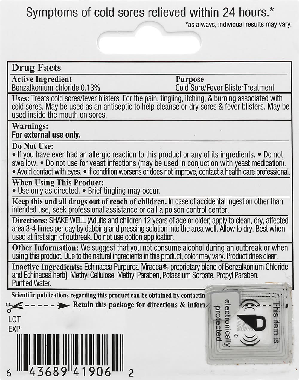 Ingredients: Active Ingredients: Benzalkonium Chloride (0.13 %), Cold Sore/Fever Blister Treatment. Inactive Ingredients: Echinacea Purpurea [Viracea, Proprietary Blend of Benzalkonium Chloride and Echinacea Herb], Methyl Cellulose, Methyl Paraben, Potassium Sorbate, Propyl Paraben, Purified Water Additives: Inactive Ingredients: Echinacea Purpurea [Viracea, Proprietary Blend of Benzalkonium Chloride and Echinacea Herb], Methyl Cellulose, Methyl Paraben, Potassium Sorbate, Propyl Paraben, Purified Water.