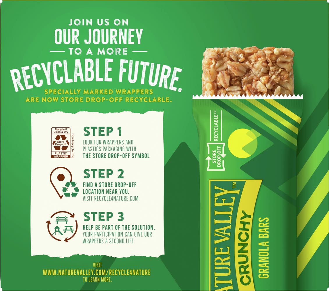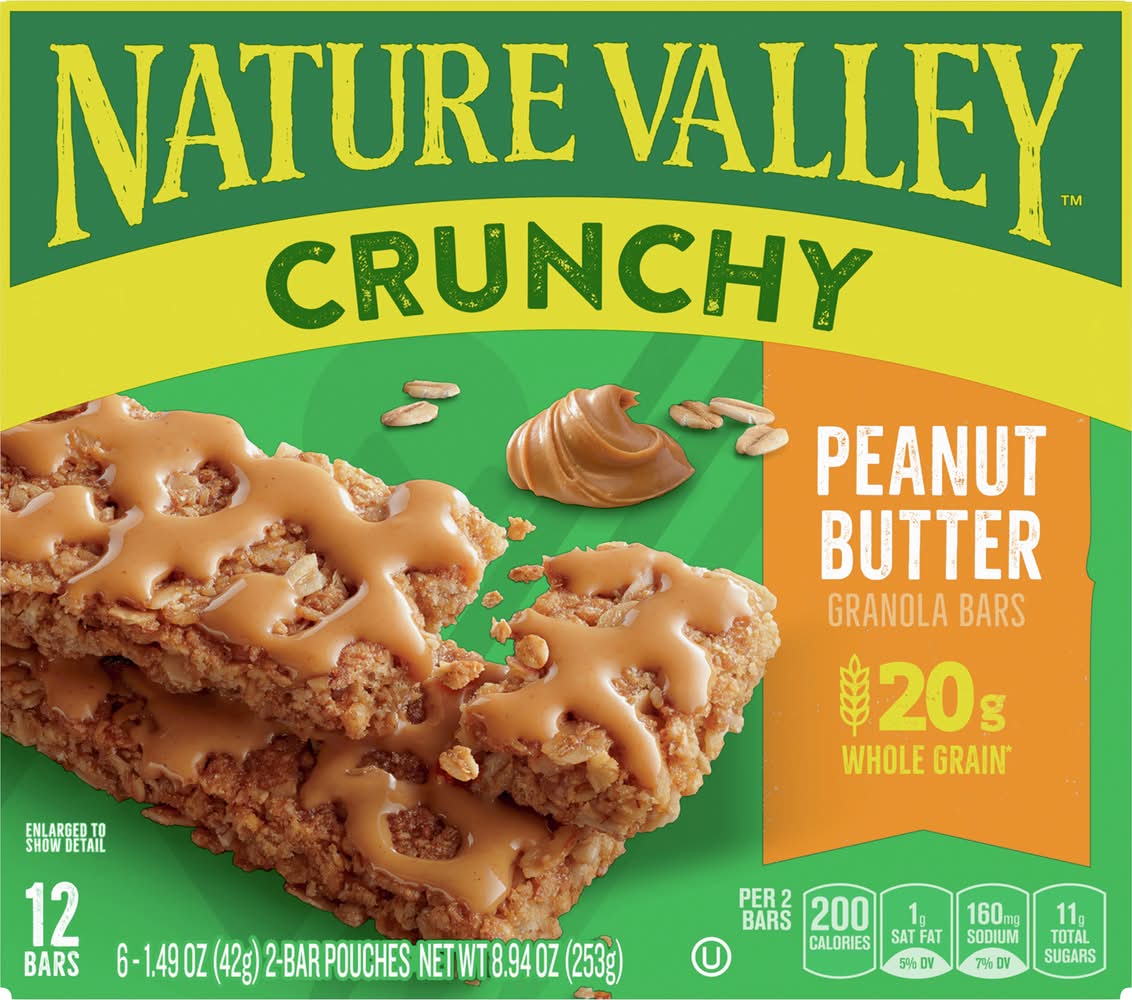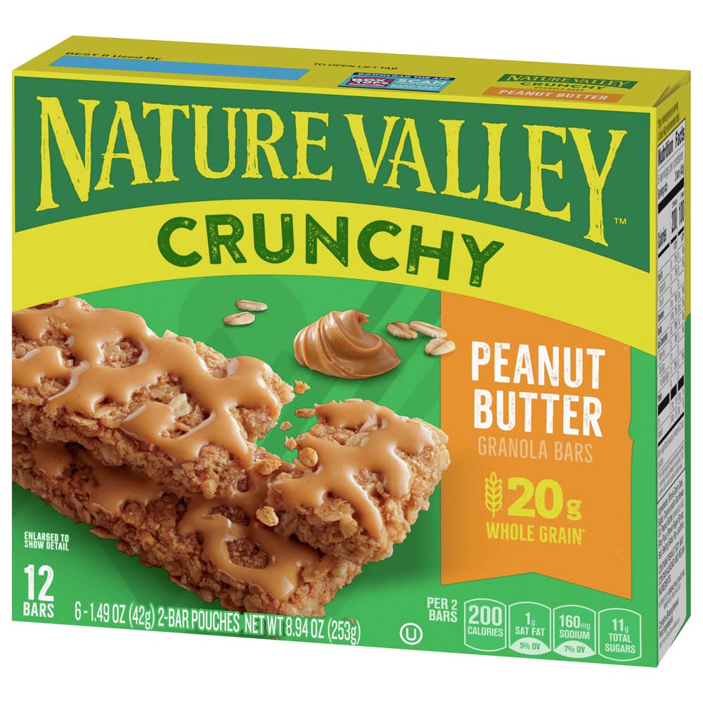 This Nate Valley crunchy granola bar gives you on-demand energy that satisfies with rich, creamy peanut butter drizzled over 100% natural whole-grain oats. Take a bar with you wherever you go thanks to individual packaging! The box uses 100% recycled paperboard. You get 16g of whole grains in each 1.49 oz package of two bars. NUTTY FLAVOR: Every bar gives you a savory peanut-buttery taste over sweet whole-grain oats to satisfy your hunger HEALTHY INGREDIENTS: The natural ingredients in this Nature Valley Crunchy Granola Bar make sure you get plenty of nutrition without any artificial colors or high fructose corn syrup TAKE THEM WITH YOU: Each box of 6 granola bars has individual packaging so you can take two 1.49 oz bars with you on the go without any mess • Flavor: Peanut butter • General Mills Sales, Inc., Minneapolis, MN, 55440 • Packaging: Reusable