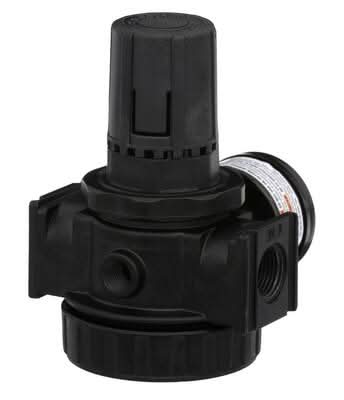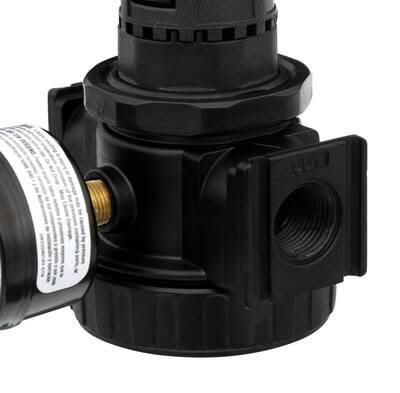 The Husky Regulator with Gauge provides regulated output pressure of 0 - 150 psi for proper tool operation. It has a self-relieving design that vents downstream air flow for easier adjustment. A locking pressure knob prevents accidental pressure changes. The inlet and outlet hook up