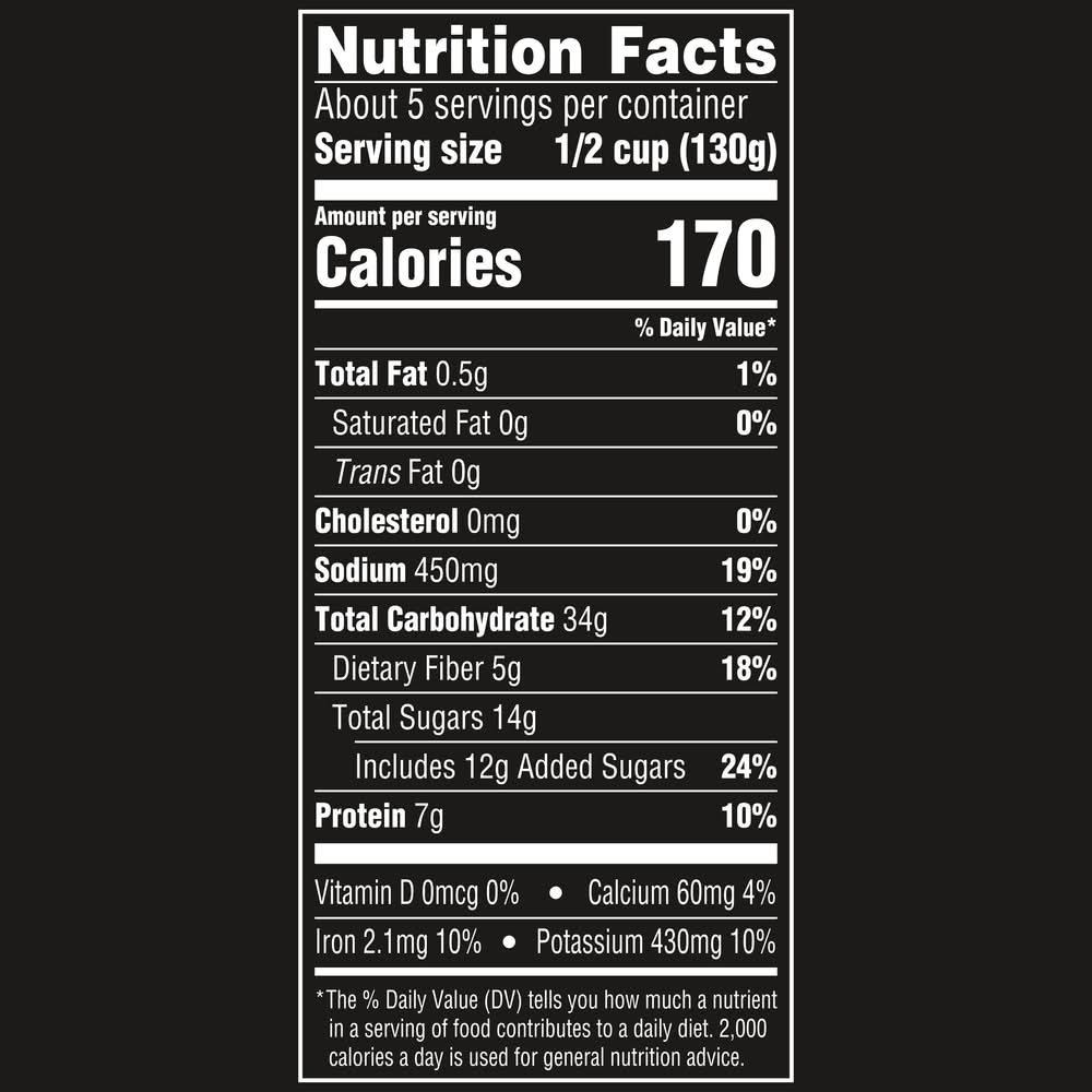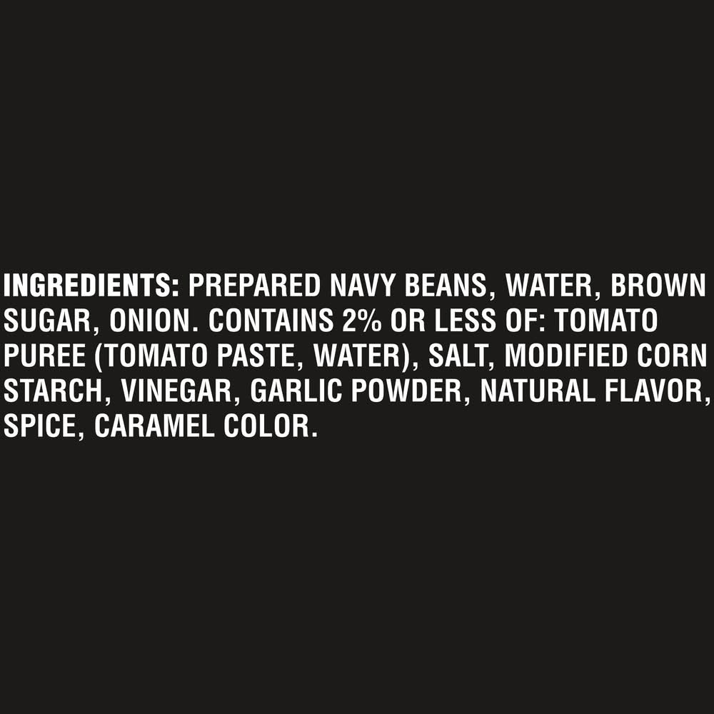 Ingredients: Prepared Navy Beans, Water, Brown Sugar, Onion. Contains 2% Or Less Of: Tomato Puree (Tomato Paste, Water), Salt, Modified Corn Starch, Vinegar, Garlic Powder, Natural Flavor, Spice, Caramel Color. Contains: corn