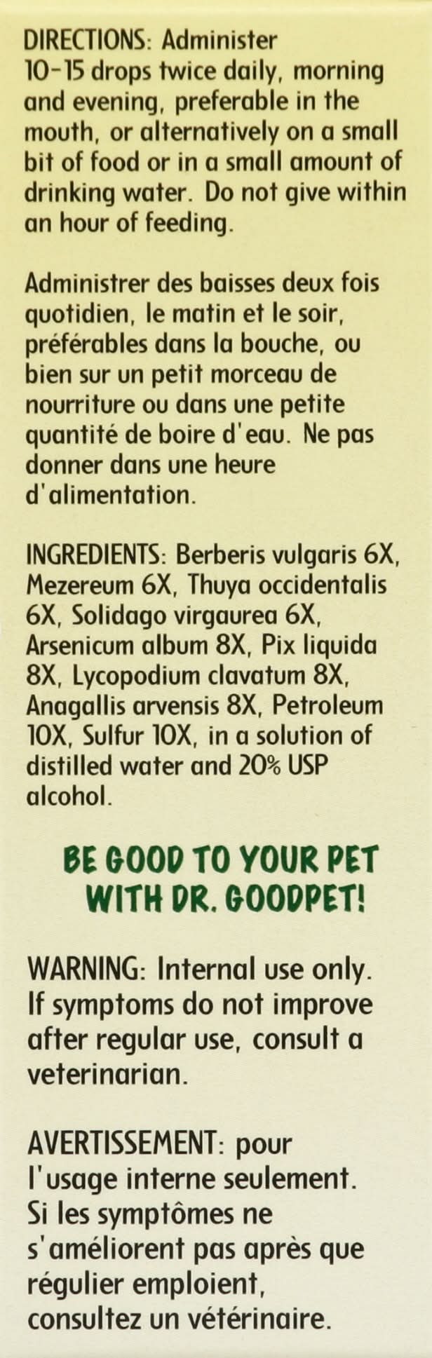 Berberis Vulgaris 6X, Mezereum 6X, Thuya Occidentalis 6X, Solidago Virgaurea 6X, Arsenicum Album 8X, Pix Liquida 8X, Lycopodium Clavatum 8X, Anagallis Arvensis 8X, Petroleum 10X, Sulfur 10X, in a Solution of Distilled Water and 20% USP Alcohol