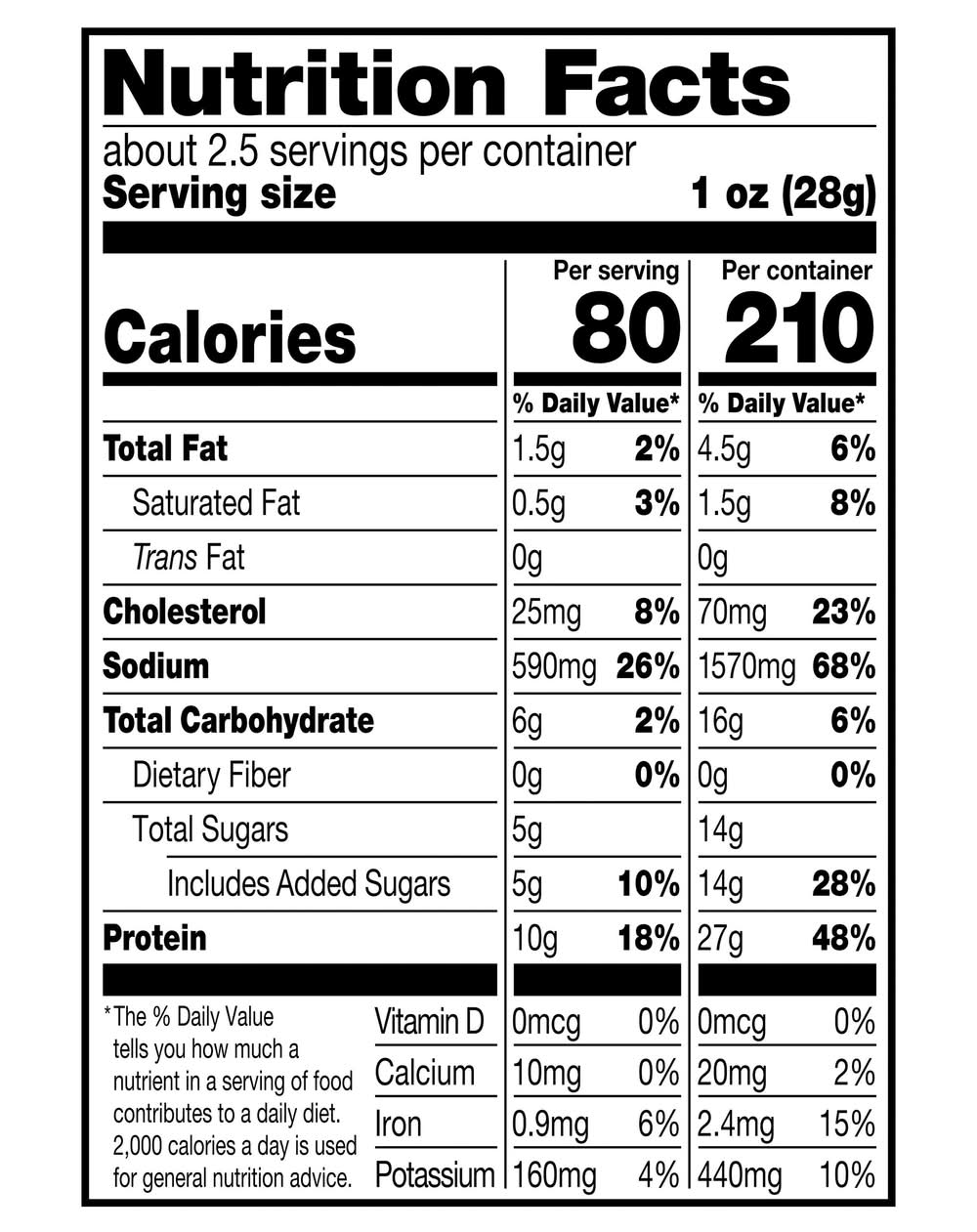 Ingredients: Beef, Water, Sugar, Contains 2% or Less of Salt, Flavors, Monosodium Glutamate, Lemon Juice Concentrate, Vinegar, Citric Acid, Torula Yeast, Sodium Nitrite
