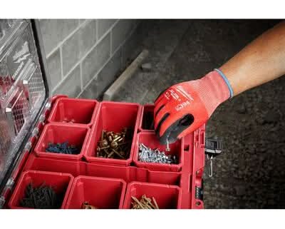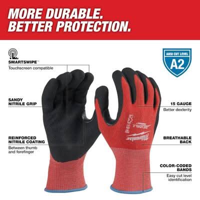 The MILWAUKEE Large cut level 2 nitrile dipped gloves are designed to provide ultimate durability and all-day comfort. These cut-resistant gloves have a reinforced nitrile coating between the thumb and index finger for enhanced durability in high wear points. The SMARTSWIPE index fingertips provide users with full access to their touchscreen devices without removing the gloves, and the textured nitrile palm provides users best-in-class grip performance. The work gloves are knit with 15 gauge material for better dexterity when handling small objects. These Milwaukee gloves are made of a nylon and lycra blend to provide all-day comfort and wick away moisture.