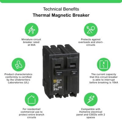 The Square D by Schneider Electric Homeline 60 Amp Two-Pole Circuit Breaker is used for overload and short-circuit protection of your electrical system. This breaker is compatible with Homeline load centers and CSED devices. The ANSI-certified and UL-listed unit is rated for 120/240 VAC and 10,000 AIR. Homeline circuit breakers are built with the same Square D brand quality you have come to expect at a price that makes them the best value in their class. Homeline circuit breakers are the best in class. Designed exclusively for the residential market, Homeline products offer everything you need to distribute electricity throughout your home.