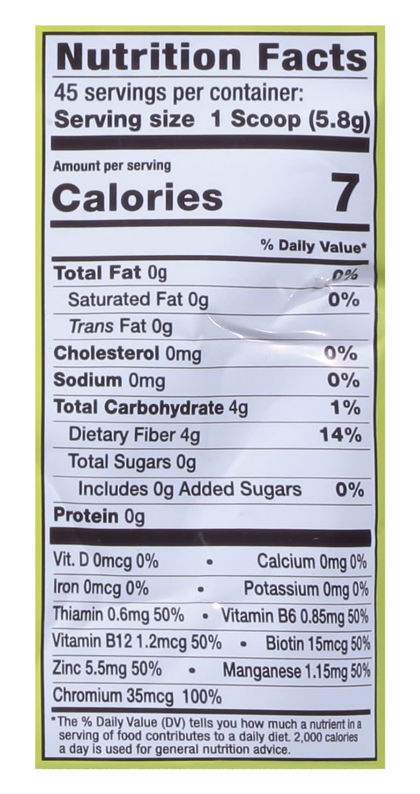 Ingredients: Soluble Corn Fiber, Decaffeinated Tea Powder, Natural Flavor Wonf, Malic Acid, Citric Acid, Banaba Leaf P.E, Sucralose. Vitamins and Minerals: Thiamine, Pyridoxine, Cyanocobalamin, Biotin, Zinc Picolinate, Manganese Citrate, Chromium Picolinate Contains: Corn
