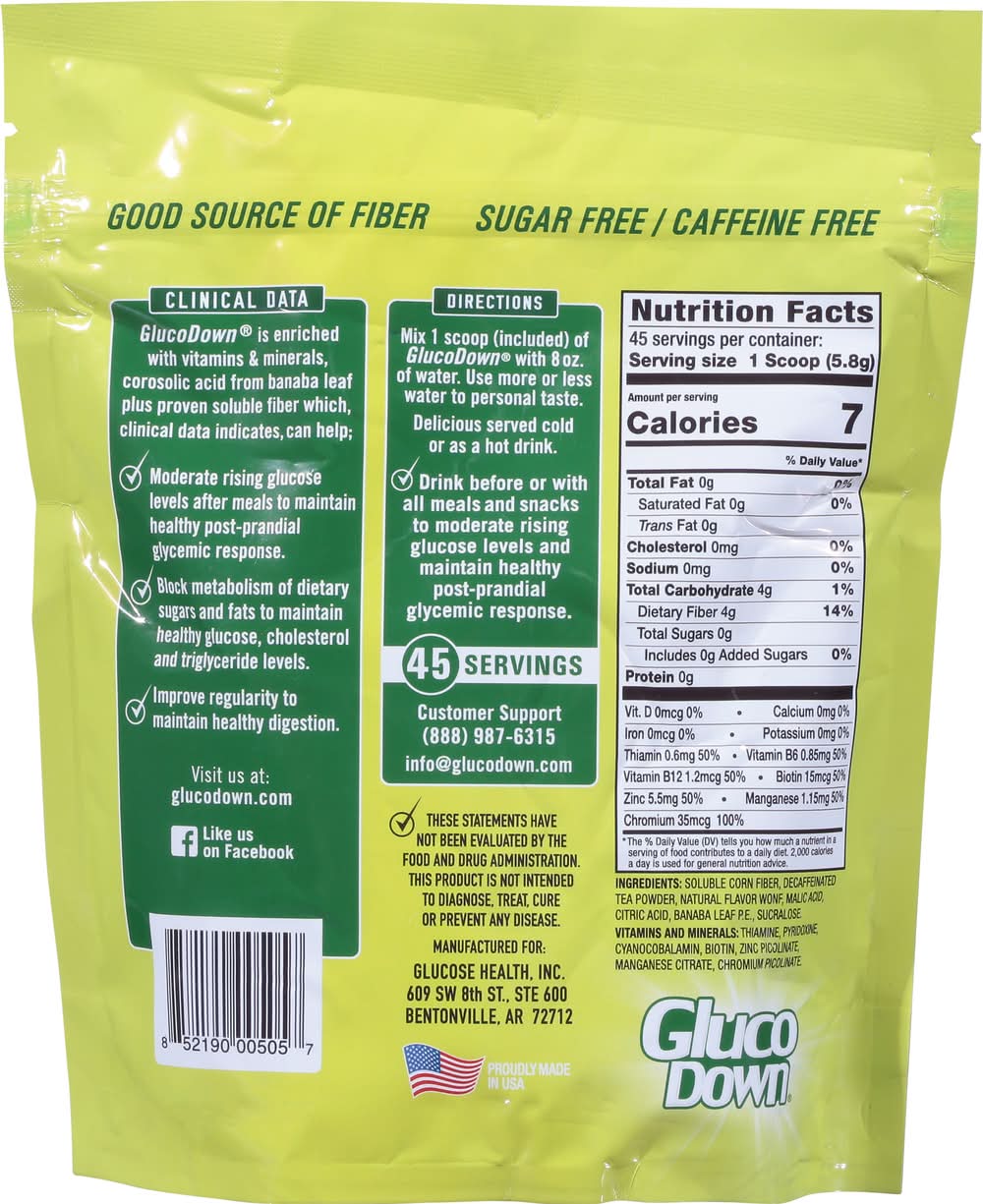 Directions: mix 1 scoop (included) of glucodown with 8 oz. of water. use more or less water to personal taste. delicious served cold or as a hot drink. drink before or with all meals and snacks to moderate rising glucose levels and maintain healthy post-prandial glycemic response.