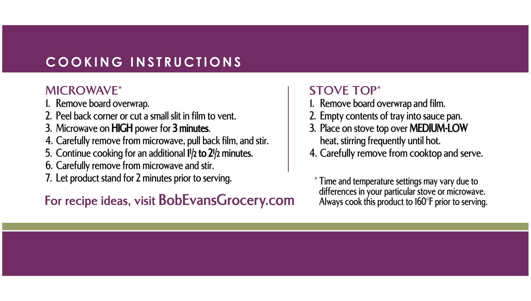 Directions for use: Microwave: Cooking Instructions Microwave* 1. Remove board overwrap. 2. Peel back corner or cut a small slit in film to vent. 3. Microwave on high power for 3 minutes. 4. Carefully remove from microwave, pull back film, and stir. 5. Continue cooking for an additional 1-1/2 to 2-1/2 minutes. 6. Carefully remove from microwave and stir. 7. Let product stand for 2 minutes prior to serving. *Time and temperature settings may vary due to differences in your particular stove or microwave. Always cook this product to 160°F prior to serving. Pan Fry: Stove Top* 1. Remove board overwrap and film. 2. Empty contents of tray into sauce pan. 3. Place on stove top over medium-low heat, stirring frequently until hot. 4. Carefully remove from cooktop and serve. *Time and temperature settings may vary due to differences in your particular stove or microwave. Always cook this product to 160°F prior to serving. Keep refrigerated. Storage recommendation: Keep refrigerated.