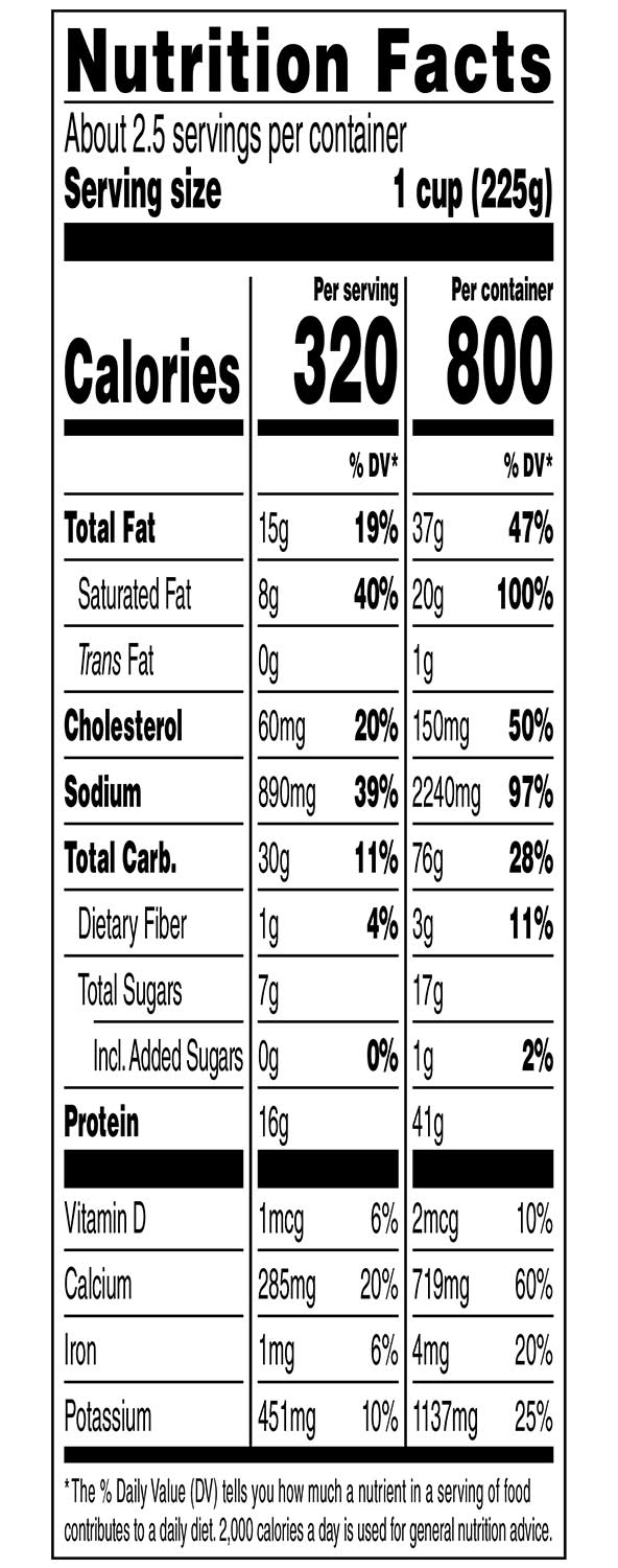 Cooked Enriched Pasta (Water, Pasta (Semolina [Wheat], Egg Whites, Niacin, Iron [Ferrous Sulfate], Thiamin Mononitrate, Riboflavin, Folic Acid)), Milk, Water, Chicken (White Meat Chicken, Water, Soybean and Sunflower Oil, Salt, Seasoning [Dehydrated Chicken Broth, Chicken Powder, Flavor, Disodium Phosphate], Seasoning [Dehydrated Garlic, Dehydrated Onion, Dehydrated Red Bell Pepper, Sugar, Spices, Paprika, Canola Oil], Dextrose, Sodium Phosphate, Spice Extractives), Alfredo Sauce Mix (Modified Food Starch, Sweet Cream Solids, Nonfat Dry Milk, Whey, Salt, Palm Oil, Corn Syrup Solids, Romano Cheese [Cow's Milk, Salt, Cheese Cultures, Enzymes], Parmesan Cheese [Milk, Salt, Cheese Cultures, Enzymes], Maltodextrin, Natural Parmesan Cheese Flavors, Sugar, Whey Protein Concentrate, Natural Flavors, and Less than 2% Butter, Buttermilk Powder, Onion, Sunflower Lecithin, Disodium Phosphate, Sodium Caseinate, Yeast Extract, Lactic Acid, Spice, Calcium Lactate, Xanthan Gum, Mono & Diglycerides and Soybean Oil (Added as Processing Aids)), Butter (Cream, Salt), Contains Less than 2% of Citric Acid, Cultured Nonfat Dry Milk, Garlic, Potassium Salt (Potassium Chloride, Wheat Flour), Nutmeg, Parmesan Cheese (Part-Skim Milk, Cheese Culture, Salt, Enzymes), Romano Cheese (Milk, Cheese Culture, Salt, Enzymes). Contains: Eggs, Milk, Wheat, Soybeans