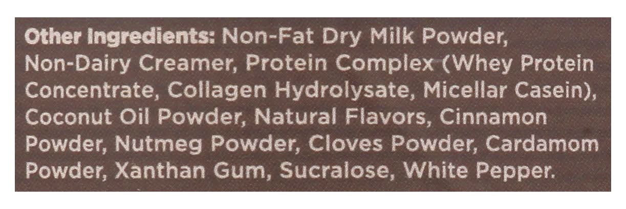 Other Ingredients: Non-Fat Dry Milk Powder, Non-Dairy Creamer, Protein Complex (Whey Protein Concentrate, Collagen Hydrolysate, Micellar Casein), Coconut Oil Powder, Natural Flavors, Cinnamon Powder, Nutmeg Powder, Cloves Powder, Cardamom Powder, Xanthan Gum, Sucralose, White Pepper Contains: Milk, Tree Nuts