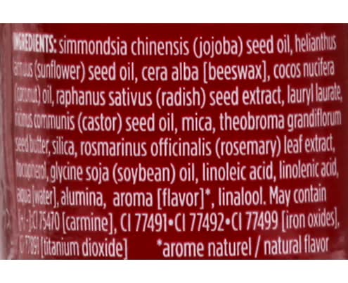 Simmondsia Chinensis (Jojoba) Seed Oil, Helianthus Annuus (Sunflower) Seed Oil, Cera Alba [Beeswax], Cocos Nucifera (Coconut) Oil, Raphanus Sativus (Radish) Seed Extract, Lauryl Laurate, Mica, Theobroma Grandiflorum Seed Butter, Silica, Rosmarinus Officinalis (Rosemary) Leaf Extract, Tocopherol, Glycine Soja (Soybean) Oil, Linoleic Acid, Linolenic Acid, Aqua [Water], Alumina, Aroma [Flavor] (Natural Flavor), Linalool. May Contain [+/-]: CI 75470 [Carmine], CI 77491, CI 77492, CI 77499 [Iron Oxides], CI 77891 [Titanium Dioxide] Contains: Tree Nuts, Soybeans