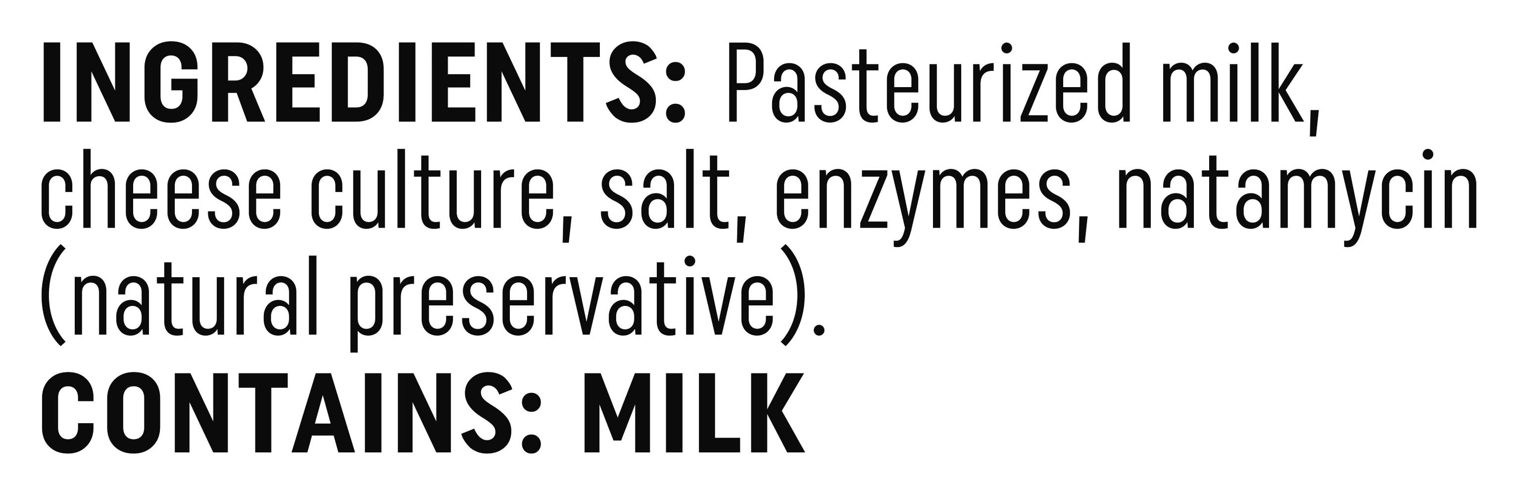 Pasteurized milk, cheese culture, salt, enzymes, natamycin (natural preservative).