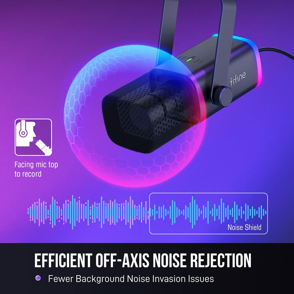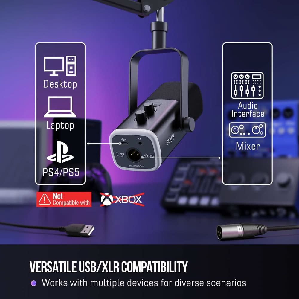 Professional Sound, Anywhere You Go. Meet the FIFINE AM8T, a versatile dynamic microphone designed for effortless, high-quality audio. With both XLR and USB connectivity, it's perfect for PCs, laptops, and even mobile devices—so you can record, stream, or chat from anywhere. Built-in RGB lighting adds a personal touch, while one-touch mute, volume control, and real-time headphone monitoring via the 3.5mm jack keep you in command. Plus, the included boom arm stand ensures optimal positioning for any setup. Whether at home, in the studio, or on the move, the AM8T delivers rich, professional sound with ease.