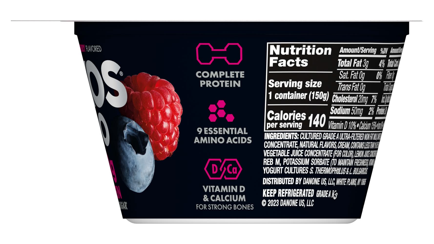 Go Pro with Pro Mixed Berry Yogurt-Cultured Ultra-Filtered Milk Product, the spoon able high protein snack with more of what you want, and less of what you don’t. Every serving contains 0g added sugar and nine essential amino acids, in addition to vitamin D and calcium for strong bones. Each Pro snack cup packs a punch with 20g of protein per serving, so you can always have dependable, high protein snacks to help you add more protein to your day. Because when you feel strong, you are unstoppable. With protein and deliciousness, these snacks for adults can help you strive to reach your potential with every serving. Protein is important - an essential nutrient that we need in our diet - and Pro cups are great tasting, convenient solutions for adding complete protein every day. Pack a mixed berry snack cup for days that start at a sprint and enjoy a delicious boost of protein at lunch. Each snack cup leaves room for toppings, so throw in your favorite fruit for an extra refreshing snack. Need 0g added sugar 0 artificial sweeteners, and 0% fat Try Triple Zero with 15g of protein per serving. Want the creamy one with the fruit pieces has you covered. Stronger Makes Everything Better Not a low-calorie food. • Flavor: Mixed berry • Packaging: Reusable