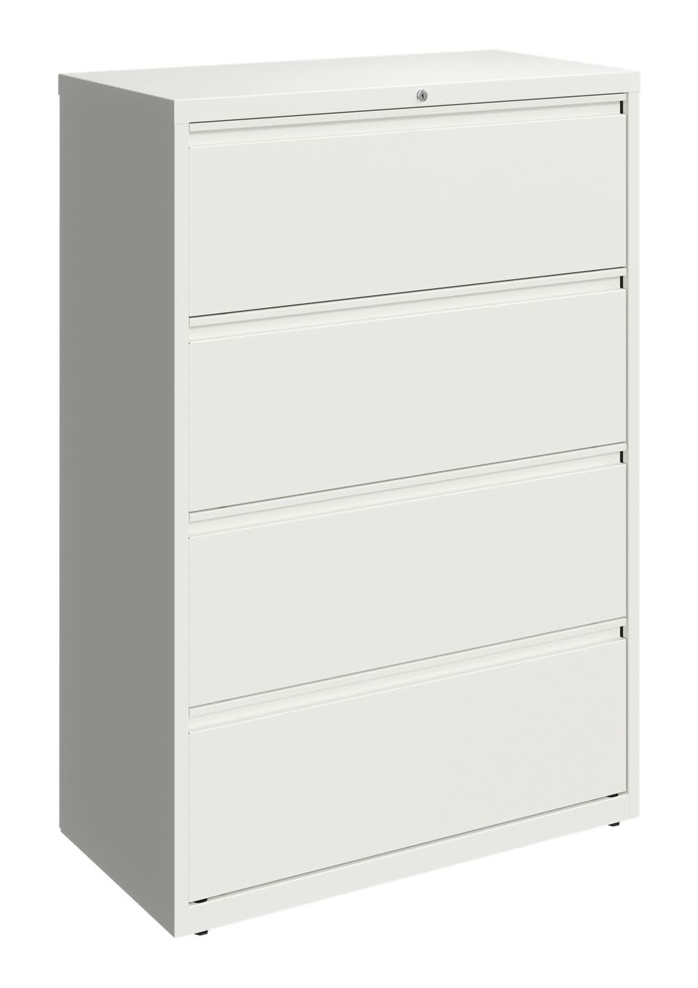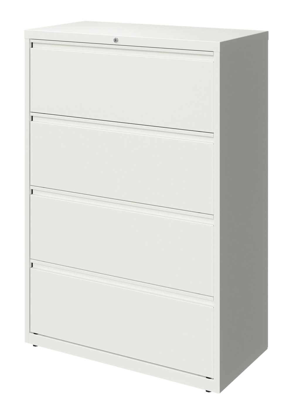 This 36 inch wide 4-drawer commercial-grade lateral filing cabinet is designed for heavy-duty use, yet looks great in any office. Precision ball-bearing suspension allows for quiet use in your busy office environment. Fully assembled steel construction with reinforced base. Non-porous surface is easy to clean and disinfect. Interlock system prevents tipping by only allowing one drawer open at a time. Dual lock bars and core-removable lock come standard. Unit includes hang rails, magnetic label holders, and four adjustable leveling glides. Hirsh Industries,
