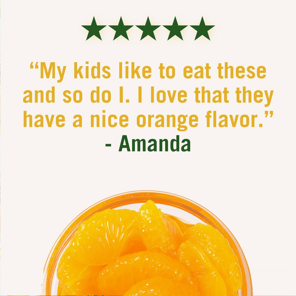No Sugar Added** **Not a low calorie food - see nutrition panel for sugar and calorie content. Non GMO Ingredients of the types used in this product are not genetically modified Non BPA Packaging produced without the intentional addition of BPA Serving Up Our Garden's Best Sun-Sweetened Goodness Our juicy Mandarin oranges are grown in the best soils, producing fruit with the perfect texture and balanced sweet and tart flavor. Tasty Nutrition-with No Added Sugar Picked at the peak of ripeness to capture the flavor and nutrients your family craves. Simply delicious, with no added sugar. Delicious to Go With breakfast, on-the-go or as a lunchbox favorite-a great way to add a little sweetness to your day. • Del Monte Foods, Walnut Creek, CA 94598 • Packaging: Reusable