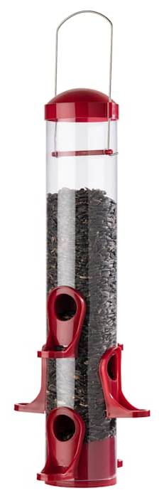 Songbird Feeder is a beautiful red tube feeder constructed of plastic that keeps seed levels within view so you know when it's time to refill. Songbirds love its ergonomic U-shaped perches, while 6 strategically placed ports provide feeding space for many birds simultaneously. The feeder disassembles for easy cleaning, while its cap slides up the hanging wire for easy filling. A metal hanger comes pre-attached for convenient hanging. With a 1.7 lb. seed capacity, Feeder is attractive to a wide variety of birds, turning your backyard birding station into a songbird feeding destination!