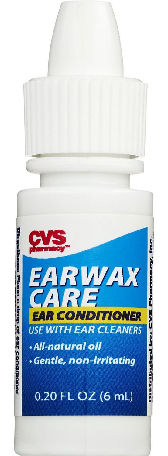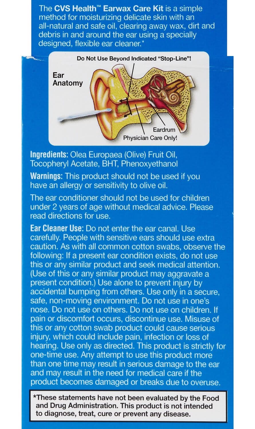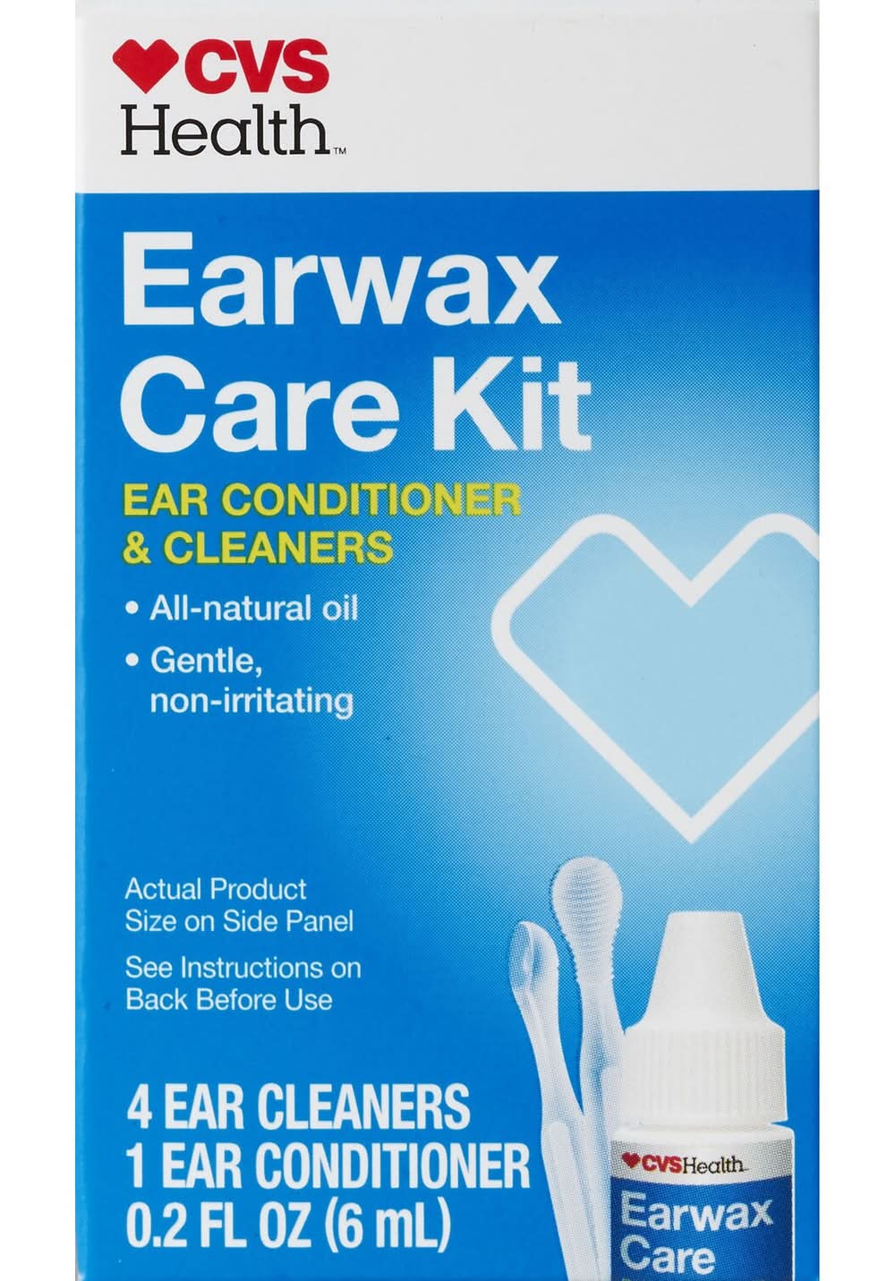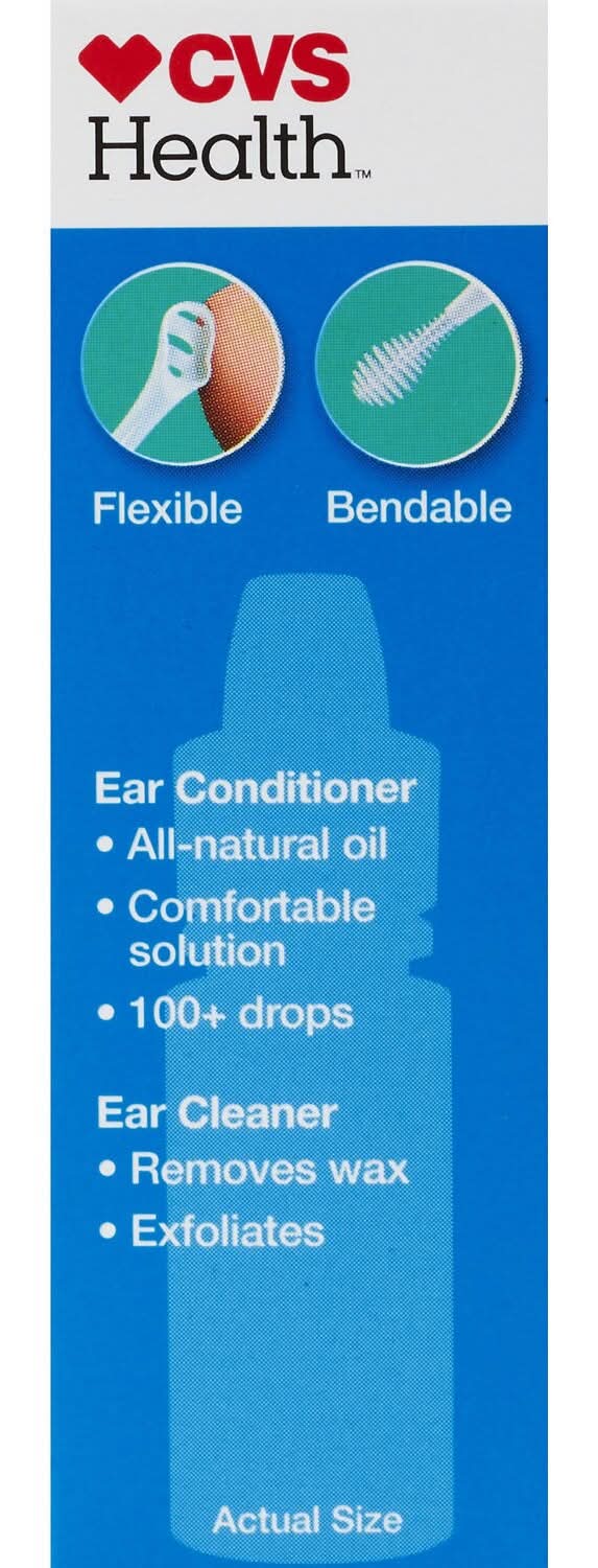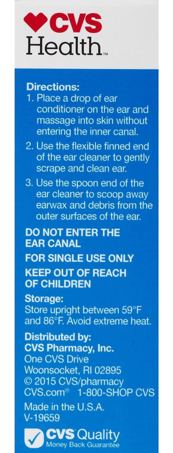 4 ear cleaners; 1 ear conditioner (0.18 fl oz/5.1 ml). Ear conditioner & cleaners. All-natural oil. Gentle, non-irritating. The CVS/pharmacy Earwax Care Kit is a simple method for moisturizing delicate skin with an all-natural and safe oil, cleaning away wax, dirt and debris in and around the ear using a specially designed, flexible ear cleaner. Flexible. Bendable. Ear Conditioner: all-natural oil; comfortable solution; 100+ drops. Ear Cleaner: removes wax; exfoliates. CVS quality guarantee. www.cvs.com. (These statements have not been evaluated by the Food and Drug Administration. This product is not intended to diagnose, treat, cure or prevent any disease.) Made in the USA. Made in America.