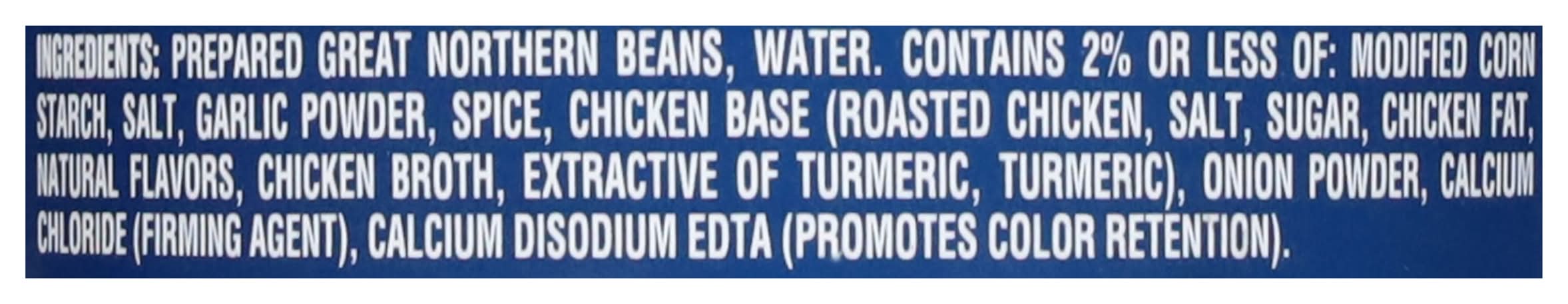 Ingredients: Prepared Great Northern Beans, Water. Contains 2% or Less of: Modified Corn Starch, Salt, Garlic Powder, Spice, Chicken Base (Roasted Chicken, Salt, Sugar, Chicken Fat, Natural Flavors, Chicken Broth, Extractive of Turmeric, Turmeric), Onion Powder, Calcium Chloride (Firming Agent), Calcium Disodium EDTA (Promotes Color Retention).