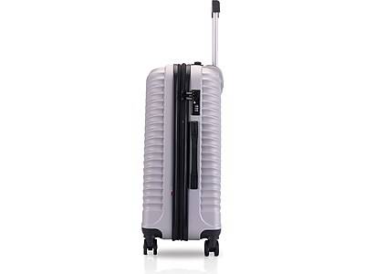 TUCCI brings the atmosphere of Venice to this design, one of the most romantic cities in the world. With waves, microdiamond texture, and replaceable wheels, carrying the Italy FLETTERE suitcase is so easy it feels like pushing a boat that floats in the air. - This suitcase with eight-wheel glide-tech system and telescoping handle is designed to withstand the rigors of travel - Overall dimensions: 26.7H x 17.7W x 10.2D; internal dimensions: 24H x 17W x 9.6D - Made of flexible, durable, and lightweight ABS plastic in silver color with soft jelly handle grips in black - Deluxe interior with signature lining - Scratch-resistant texture and built-in combination lock for added security - 2 expansion for up to 35% extra space - Weight: 6.6 lbs. - 10-year manufacturer limited warranty