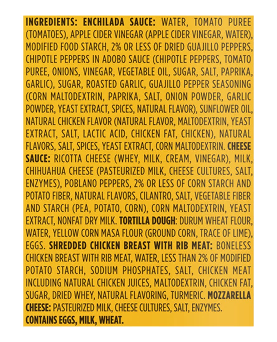 Enchilada Sauce: Water, Tomato Puree (Tomatoes), Apple Cider Vinegar (Apple Cider Vinegar, Water), Modified Food Starch, 2% or Less of Dried Guajillo Peppers, Chipotle Peppers in Adobo Sauce (Chipotle Peppers, Tomato Puree, Onions, Vinegar, Vegetable Oil, Sugar, Salt, Paprika, Garlic), Sugar, Roasted Garlic, Guajillo Pepper Seasoning (Corn Maltodextrin, Paprika, Salt, Onion Powder, Garlic Powder, Yeast Extract, Spices, Natural Flavor), Sunflower Oil, Natural Chicken Flavor (Natural Flavor, Maltodextrin, Yeast Extract, Salt, Lactic Acid, Chicken Fat, Chicken), Natural Flavors, Salt, Spices, Yeast Extract, Corn Maltodextrin, Cheese Sauce: Ricotta Cheese (Whey, Milk, Cream, Vinegar), Milk, Chihuahua Cheese (Pasteurized Milk, Cheese Cultures, Salt, Enzymes), Poblano Peppers, 2% or Less of Corn Starch and Potato Fiber, Natural Flavors, Cilantro, Salt, Vegetable Fiber and Starch (Pea, Potato, Corn), Corn Maltodextrin, Yeast Extract, Nonfat Dry Milk, Tortilla Dough: Durum Wheat Flour, Water, Yellow Corn Masa Flour (Ground Corn, Trace of Lime), Eggs, Shredded Chicken Breast with Rib Meat: Boneless Chicken Breast with Rib Meat, Water, Less than 2% of Modified Potato Starch, Sodium Phosphates, Salt, Chicken Meat Including Natural Chicken Juices, Maltodextrin, Chicken Fat, Sugar, Dried Whey, Natural Flavoring, Turmeric, Mozzarella Cheese: Pasteurized Milk, Cheese Cultures, Salt, Enzymes. Contains: Eggs, Milk, Wheat, Corn