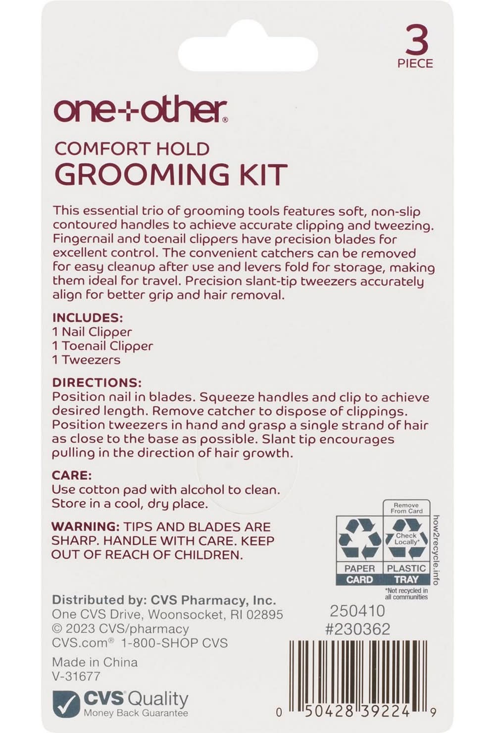 Features non-slip contoured handle For accurate clipping and tweezing Helps you achieve salon-style manicures and pedicures. Our self-care essentials are simply fun to mix+match. Because everyone deserves to feel good like her, him, them and especially you. Nail grooming is essential for everyone. However, going to the salon every time you need your nails sorted can be expensive and time-consuming. If you want to groom your nails at home, the Comfort Hold Grooming Kit will be your new favorite. This nail grooming set comes with a nail clipper, toenail clipper, and stainless steel tweezers. These three tools have soft, textured, non-slip contoured handles to help you achieve effortless and accurate clipping and tweezing. This kit also has catchers that are removable for easy cleanup after every use. The levers conveniently fold to make storage easier. This product is very portable, so aside from keeping it in your home, you can also bring it while traveling. This grooming kit is suitable for everyone. If you have cracked or split nails, you can use this grooming kit to trim them and keep them clean. If you don't clean and trim your nails, they can get brittle. They will also look unsightly and dirty. Directions First, position your nail on the blades and squeeze the handles to clip it to your desired length. Remove the catcher to dispose of your nail clippings. To use the pair of tweezers, position it near the root of the hair and pull. To clean, soak a cotton pad with alcohol and use it to wipe. Comfort Hold Grooming Kit. Store it in a cool and dry place. Warning The tip of the tweezers is sharp. Please keep it away from children.