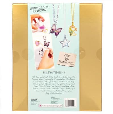 Explore the art of resin pouring and open up your own Complete with 4 metal bezels, a mold for resin jewelry charms & parts, glitter, beads, chain, elastic, protective gloves, mixing cups, ready-to-go liquid resin, and more — this set has everything you need to not only learn how to work with craft resin, but also how to use it to create custom pieces of jewelry you’ll cherish forever. Throw on the protective gloves and follow the easy-to-understand instructions to learn how to mix up your resin — then get creative and sprinkle in your choice of color, glitter, and other embellishments! Pour the resin into the butterfly, star, unicorn, or heart bezels — or use it to fill the mold frame with colors! Add a little something extra with glitter flakes and sticker designs you can position perfectly inside the resin with a pair of mini tweezers, then let it dry! Connect the bezels to premium chains with lobster clasps and jump rings, or use the charms to create custom beaded accessories to wear & share! Whether you’re already a resin expert or this is your first time exploring the art form