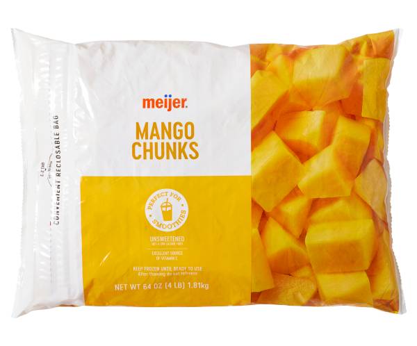 Meijer Frozen Mango Chunks, contains a blend of tart and sweet fruits, picked at their peak ripeness. It is suitable for inclusion in yogurt bowls and smoothies and can enhance healthy dishes with a dessert-like taste. This product offers a broad range of recipe possibilities.