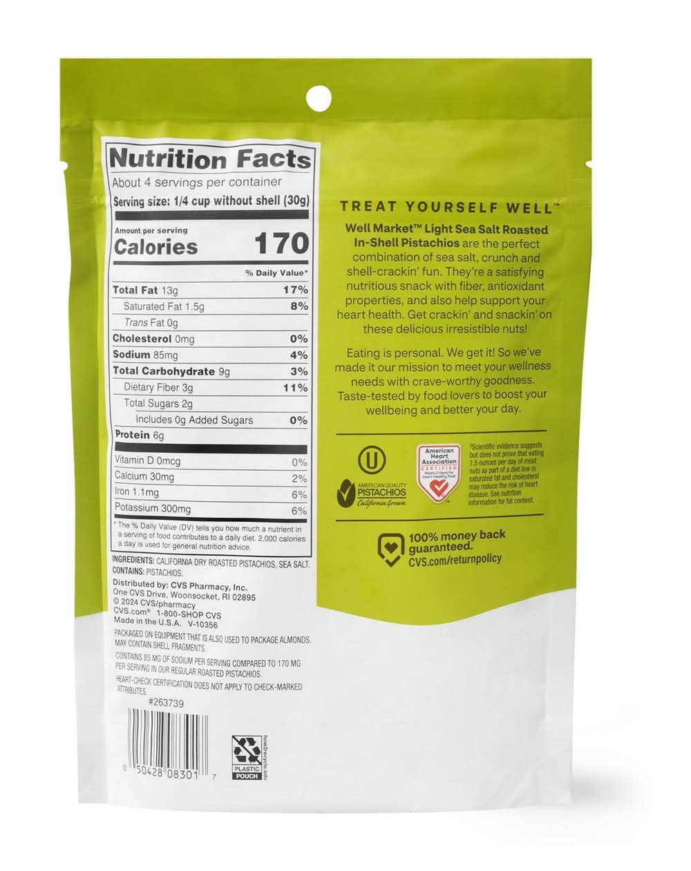 Well Market™ Light Sea Salt Roasted In-Shell Pistachios are the perfect combination of sea salt, crunch, and shell-crackin’ fun. They’re a satisfying, nutritious snack with fiber and antioxidant properties, and also help support your heart health. Get crackin’ and snackin’ on these delicious irresistible nuts! Eating is personal. We get it! So we’ve made it our mission to meet your wellness needs with crave-worthy goodness. Taste-tested by food lovers to boost your wellbeing and better your day. TREAT YOURSELF WELL™. Light Sea Salt Roasted In-Shell Gluten-free Vegan Good source of fiber which supports gut health NET WT 8oz. Gold Emblem and Gold Emblem Abound are now Well Market™ 100% money-back guarantee on Our CVS Brands. If you are not 100% satisfied with a CVS Pharmacy private brand product, you can return it for free (some exclusions apply*). For more details regarding Our CVS Brands return policy, please visit https://www.cvs.com/retail/help/return_policy.