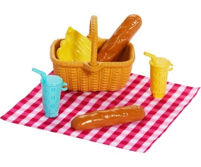 With this play set kids can play out the fun and friendship among this close squad! Barbie 'Malibu' and little sister Chelsea dolls are heading out on a picnic, and kids have all the pieces to play out the classic moment. Nine themed pieces include fashion accessories, a basket, food, drinks and blanket! For even more storytelling fun, kids can collect other toys in the Family and Friends line. Dolls cannot stand alone. Colors and decorations may vary.