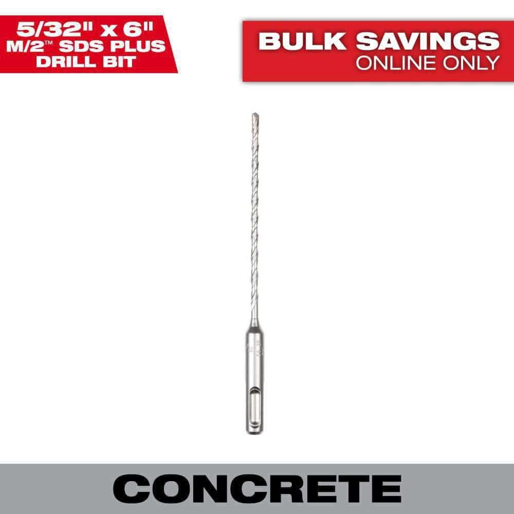 Milwaukee M/2 2-Cutter SDS-Plus Rotary Hammer Drill bits provide up to 30% faster drilling speeds and up to 20% more holes per charge in cordless rotary hammers. Breaker Point pulverize the material more effectively resulting in up 30% faster drilling speeds compared to competitive SDS-Plus drill bits. The variable flute allows for maximum debris extraction leading to up 20% more holes per charge in cordless rotary hammer while making it a very durable bit in corded and cordless rotary hammers. The enhanced rebar guards provide increased durability in hard aggregate and rebar. Additionally, M/2 features a centering tip for exact spot drilling, wear mark indicator indicating when the bit no longer meets ANSI diameter requirements, and a reinforced flute for durability and minimized vibration. The increased life and efficiency of the M/2 2-Cutter drill bit line provides the ideal solution in brick, block, and concrete for cordless and corded rotary hammer users. Size: 5/32x6 in