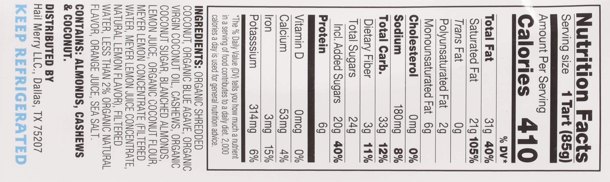 Organic Shredded, Coconut, Organic Blue Agave, Organic Virgin Coconut Oil, Cashews, Organic Coconut Sugar, Blanched Almonds, Lemon Juice, Organic Coconut Flour, Meyer Lemon Concentrate (Filtered Water, Meyer Lemon Juice Concentrate, Natural Lemon Flavor), Filtered Water, Less than 2% Organic Natural Flavor, Orange Juice, Sea Salt Contains: Tree Nuts, Almonds, Tree Nuts, Cashews, Tree Nuts, Coconuts Additives: None