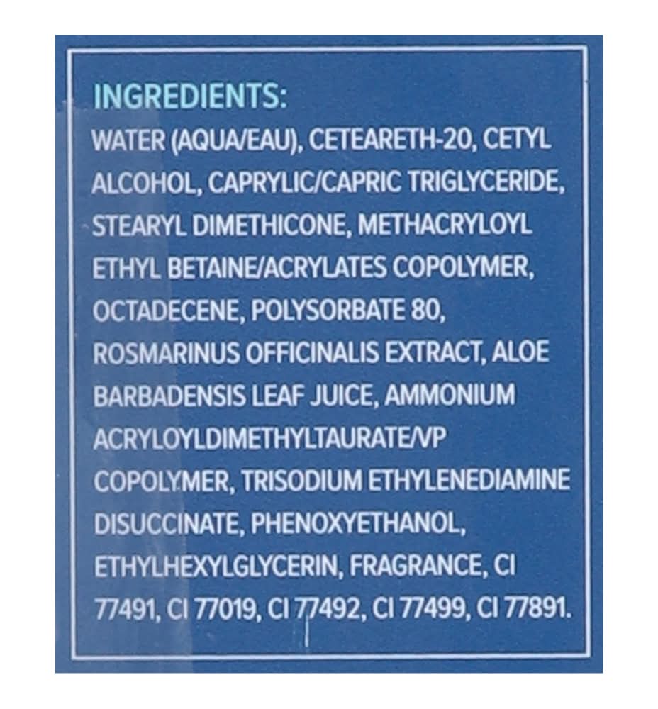 Water, Ceteareth-20, Cetyl Alcohol, Caprylic/Capric Triglyceride, Stearyl Dimethicone, Methacryloyl Ethyl Betaine/Acrylates Copolymer, Octadecene, Polysorbate 80, Rosemary (Rosmarinus Officinalis) Extract, Aloe Barbadensis Leaf Juice, Ammonium Acryloyldimethyltaurate/VP Copolymer, Trisodium Ethylenediamine Disuccinate, Phenoxyethanol, Ethylhexylglycerin, Fragrance, Iron Oxide (CI 77499), Mica (CI 77019), Titanium Dioxide (CI 77891)