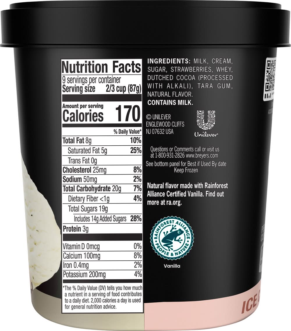 Ingredients: Milk, Cream, Sugar, Strawberries, Whey, Dutched Cocoa (Processed with Alkali), Tara Gum, Natural Flavor. Contains: Milk