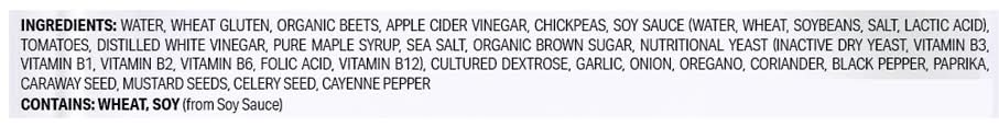 Ingredients: Water, Wheat Gluten, Organic Beets, Apple Cider Vinegar, Chickpeas, Soy Sauce (Water, Wheat, Soybeans, Salt, Lactic Acid), Tomatoes, Distilled White Vinegar, Pure Maple Syrup, Sea Salt, Organic Brown Sugar, Nutritional Yeast (Inactive Dry Yeast, Vitamin B3, Vitamin B1, Vitamin B2, Vitamin B6, Folic Acid, Vitamin B12), Cultured Dextrose, Garlic, Onion, Oregano, Coriander, Black Pepper, Paprika, Caraway Seed Mustard Seeds, Celery Seed, Cayenne Pepper Contains: Wheat, Soybeans, Gluten